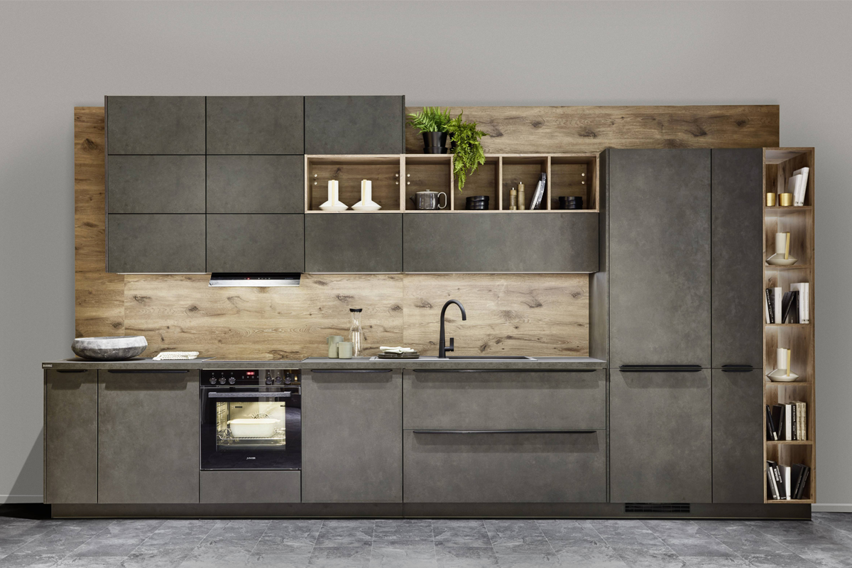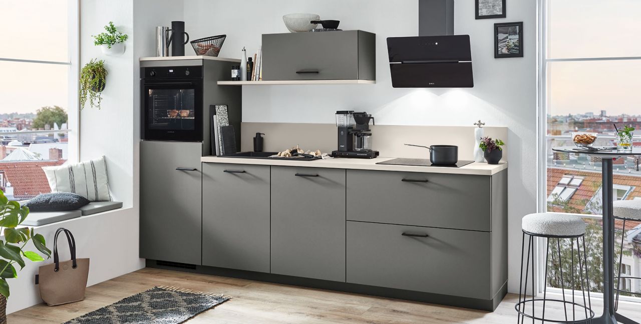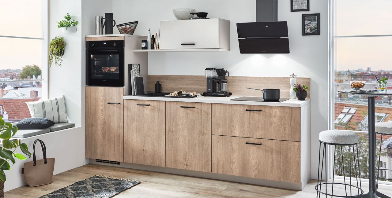 Inklusive Einbaubackofen Laurus LEB10BK Energieeffizienzklasse A, Glaskeramik Kochfeld Laurus LCA600, Designesse Edelstahl / Glas Elica WISE60BK Energieeffizienzklasse B, Kühlschrank Laurus LKG88E Energieeffizienzklasse E, Einbau-Designspüle Elleci Logik 300, XL-Schränken, Unterschrank mit Großraumauszügen, Wandbord, Wandschrank mit Klappe.