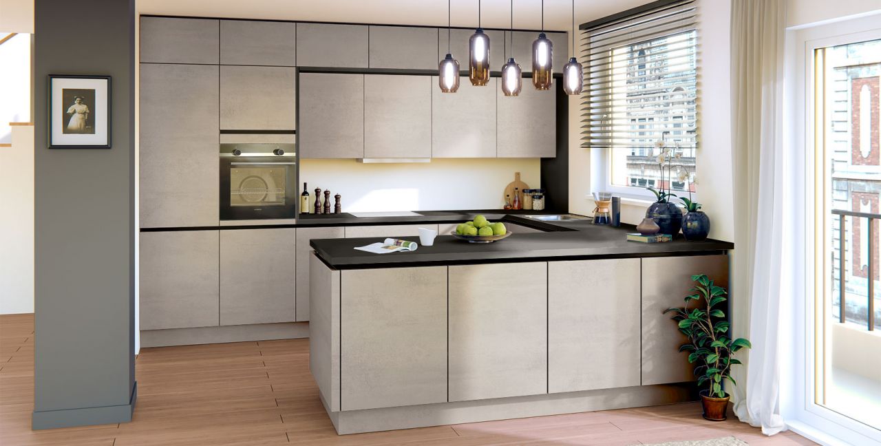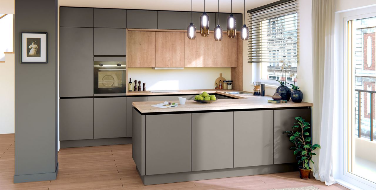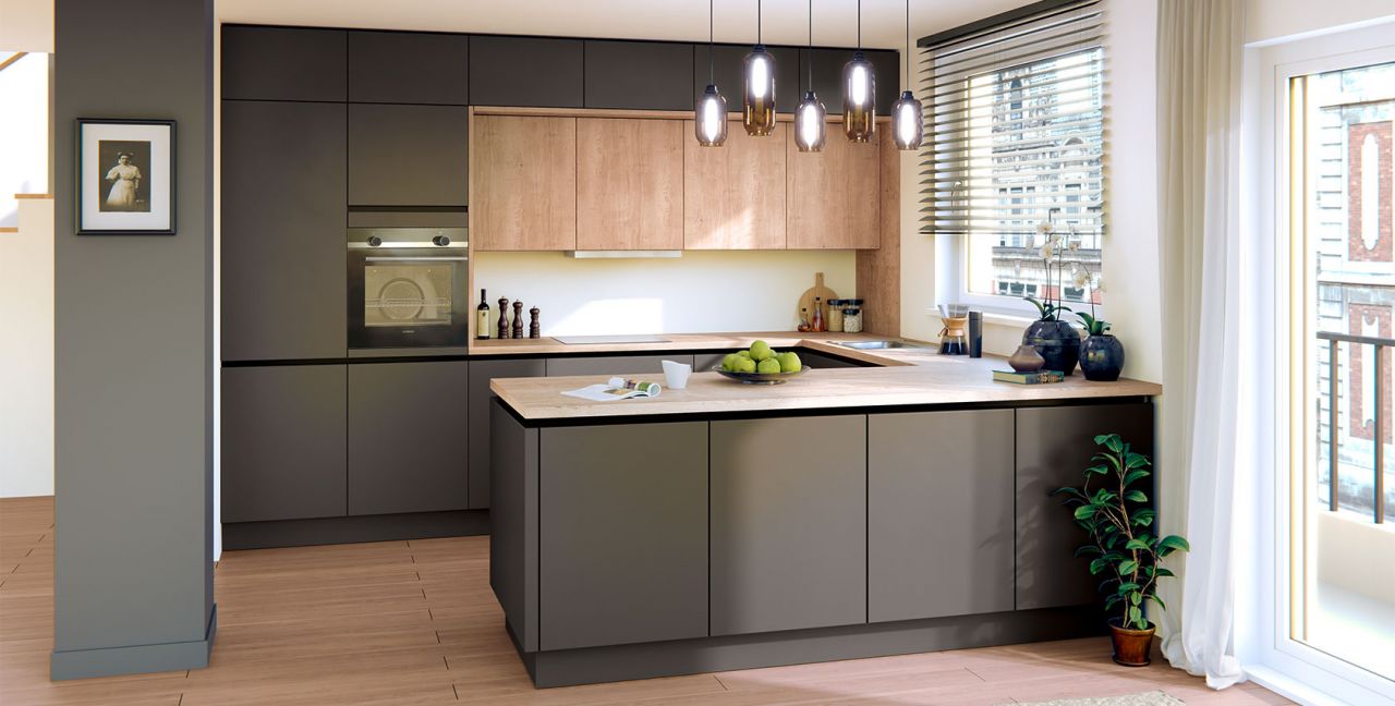Küche in U-Form Nobilia Laser LineN / Natura LineN ca. 365 x 320 x 250 cm, Front: Vulkangrau / Lacklaminat, Eiche Montreal Nachbildung, Arbeitsplatte: Eiche Montreal Nachbildung